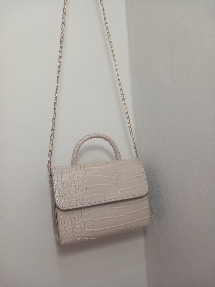 Bej renkli deri, yılan desenli ve zincir detaylı minimal tasarımlı çanta, günlük kullanıma uygundur.