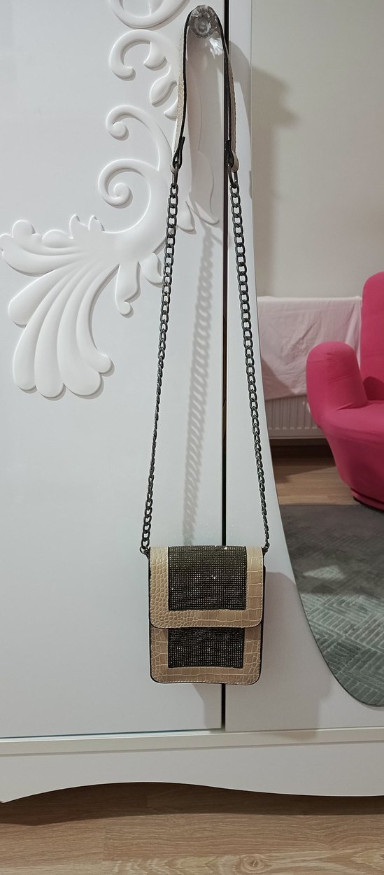 Bej deri yılan desenli, zincir detaylı çanta. Günlük kullanıma uygun, çağdaş ve sokak stiline uygun trendy bir model.