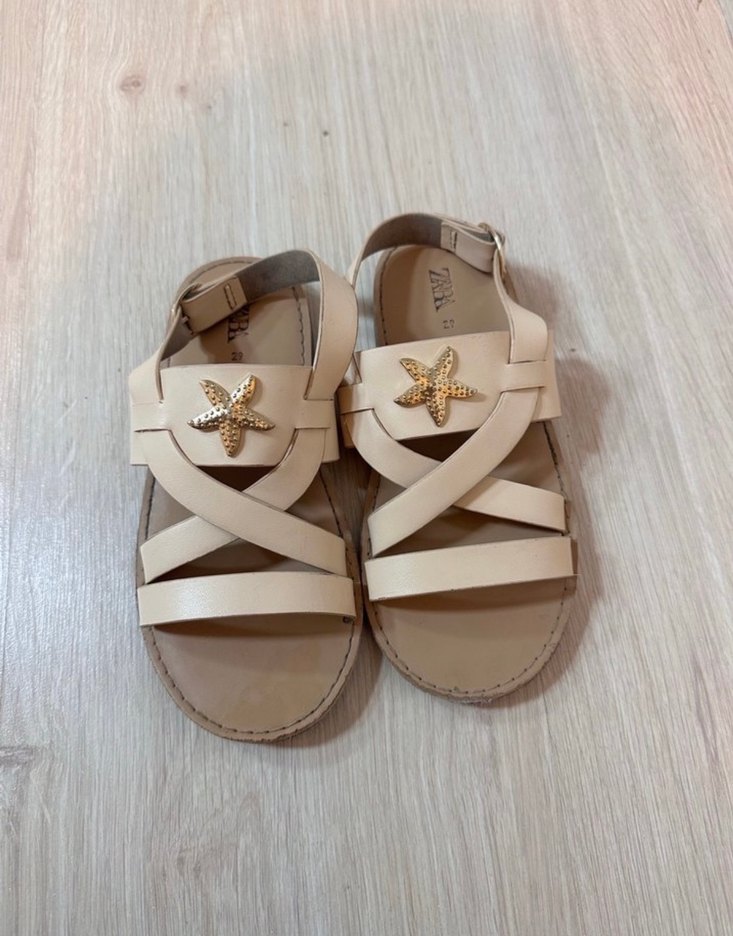 Bej deri malzemeden yapılmış, dolgu topuklu ve tokalı kayışlara sahip, yıldız detaylı minimal bohem tarzda plaj için uygun sandaletler.