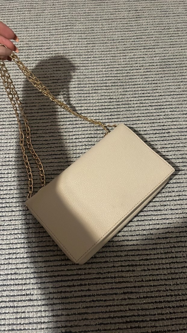 Bej deri çanta, zincir detaylı ve hafif yılan derisi desenli. Modern klasik tarzda, Paris esintili, günlük kullanıma uygun.