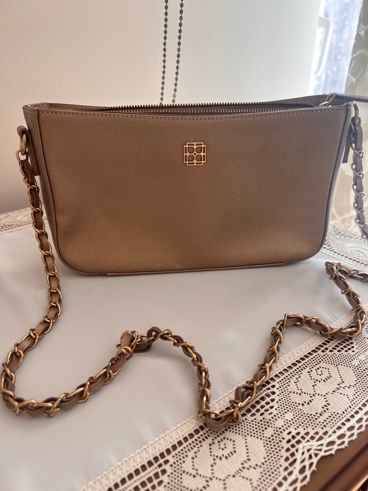 Bej renkli deri çanta, zincir detayına sahip, desen içermeyen modern klasik tarzda. Günlük kullanım için uygun, Paris şıklığını yansıtıyor.