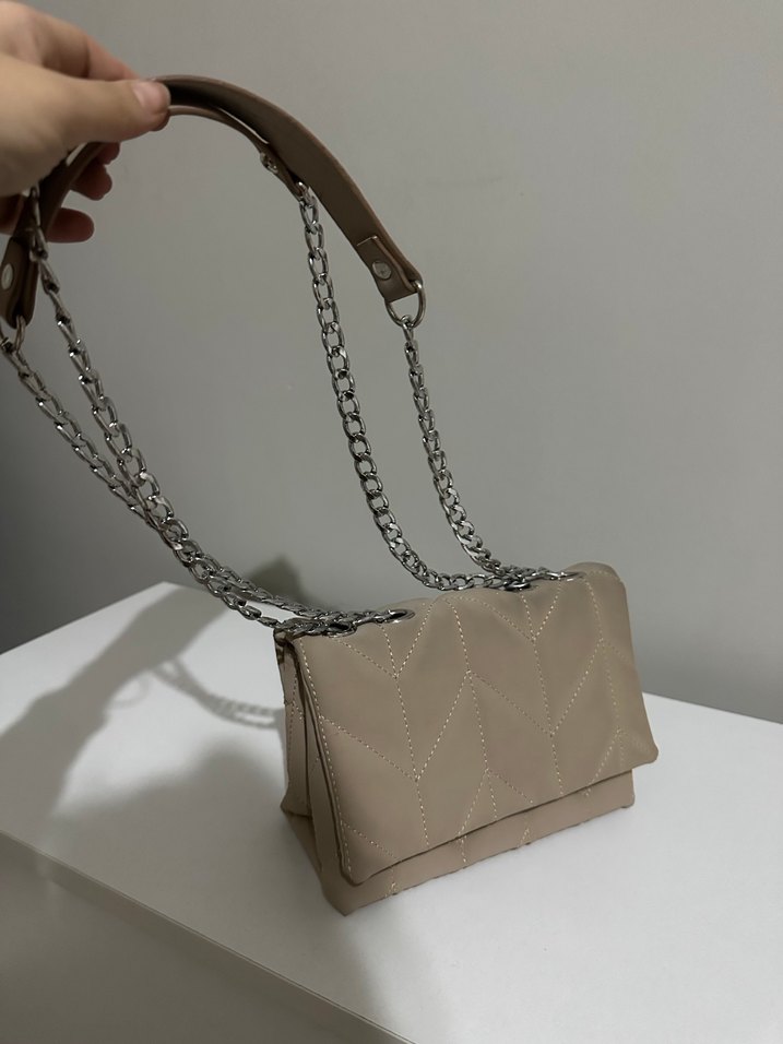 Zincir detaylı, bej deri kadın çanta, ince yılan derisi desenli, trend sokak stili için uygun.