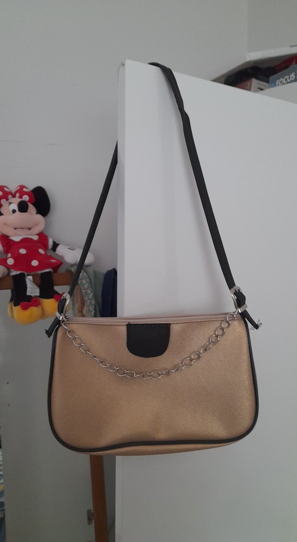 Bej renkte deri kadın çantası, zincir detayı ve siyah askısıyla trend sokak stiline uygundur.