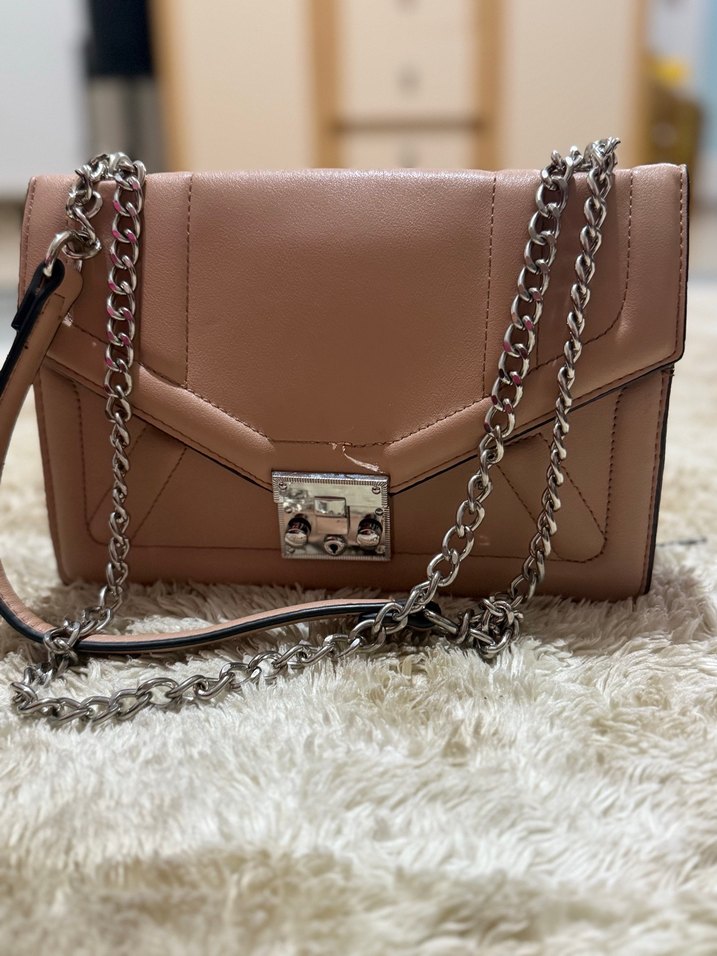 Bej renkte deri kadın çanta, zincir detaylı ve baskılı desenli. Modern klasik tarzda, Paris esintisi taşıyan günlük kullanıma uygun çanta.