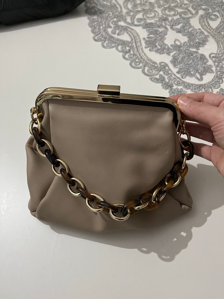 Bej Deri Zincir Detaylı Modern Klasik Çanta - Görsel 1