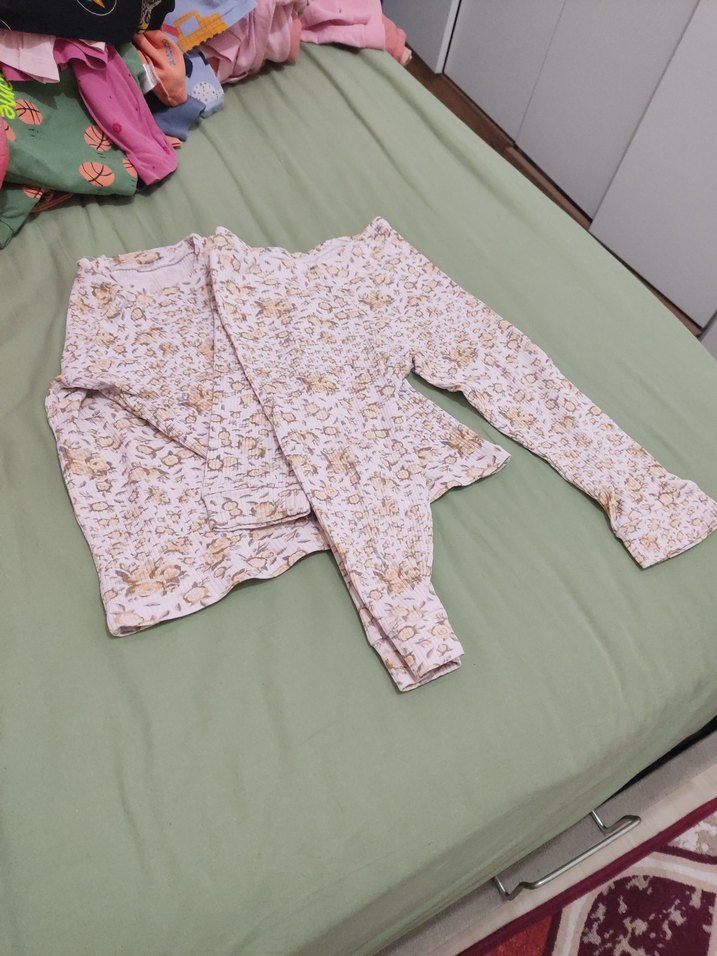 Bej renkli, desenli bebek kız takımı uzun kollu ve düğmelidir. Yumuşak pastel tonlarda, rahat kullanım sağlar.