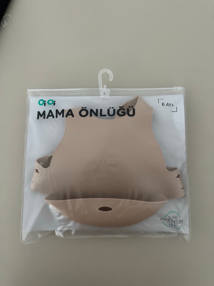 6 ay ve üzeri bebekler için bej renkli, desenli mama önlüğü. Yemek dökülmesini önleyen pratik cep bulunur