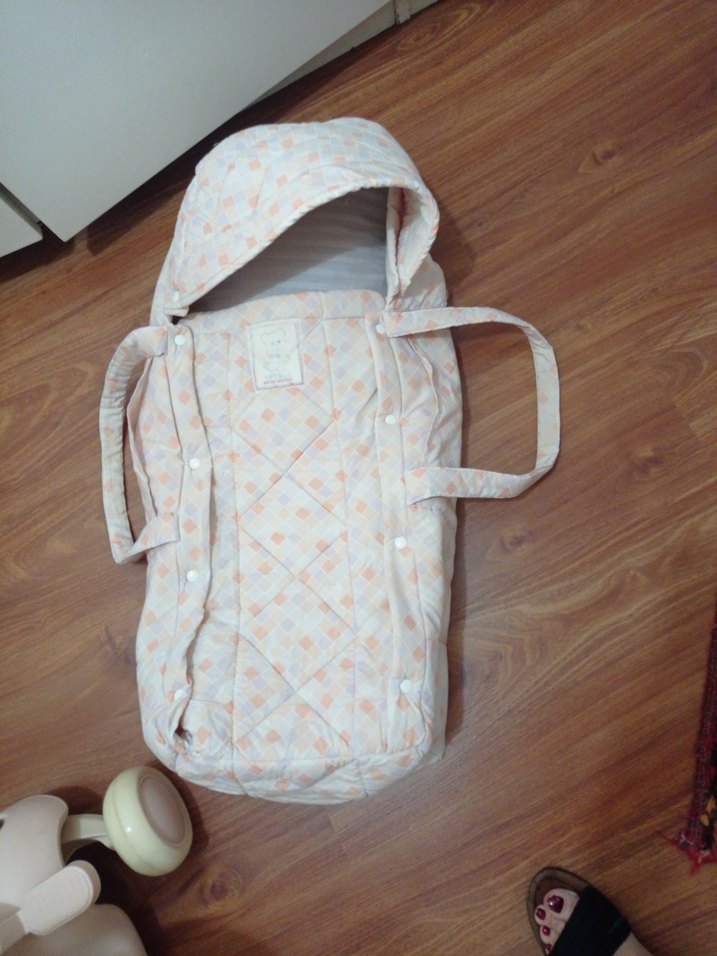 Bej renkli, pastel desenli, yumuşak kapitone kumaştan yapılmış, kulplu ve kapüşonlu bebek taşıma çantası, nostaljik Bebek puseti kendi oğlum için alıp kullanmıştım ,sakliyordum kendi çocukları için ama zaman değişti herşey değişti , şimdiki ürünler farklı ,nostalji isteryen olursa burada elimde Arzu edenler buyusunlar
