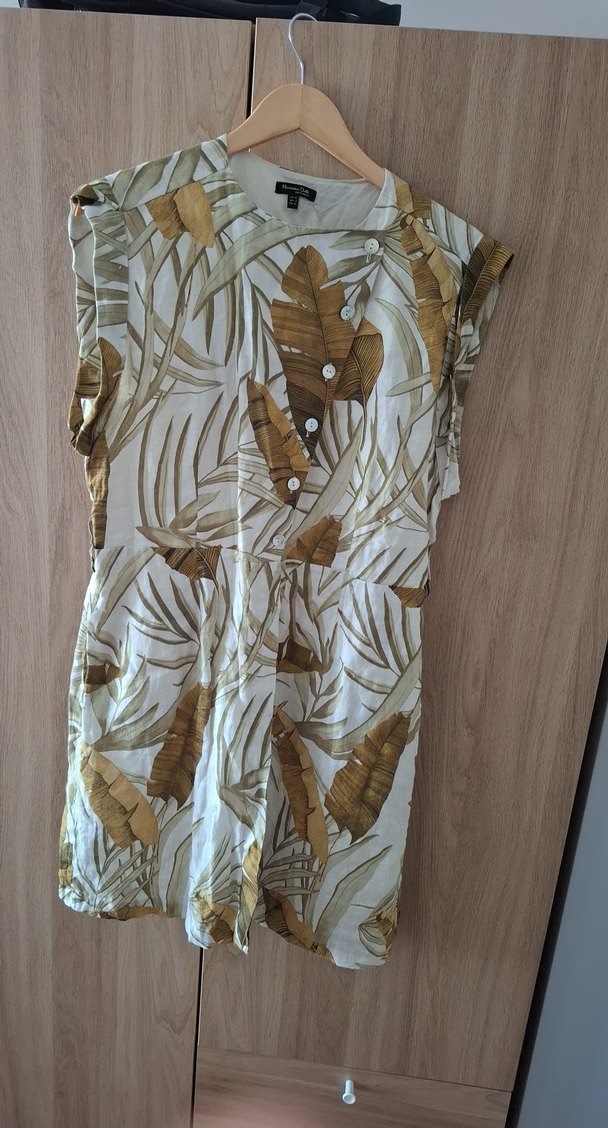 Bej renkli, düğmeli ve V yakalı, bol kesim, kolsuz, sentetik kumaştan yapılmış bohem tarzı kadın tulumu. astarlı kendinden