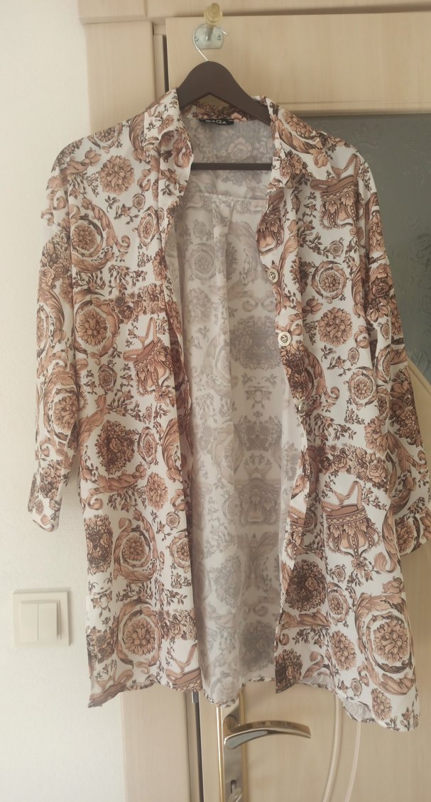 Uzun kollu, bej yılan desenli bol kesim kadın gömlek. Düğmeli ön kısmı ve kesik yakasıyla günlük kullanıma uygun.