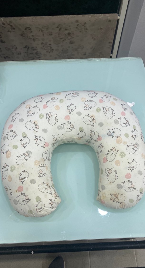 Bej renginde, pastel tonlarda hayvan desenli, hamilelik ve emzirme sırasında rahat destek sağlayan yumuşak kumaşlı yastık. Biraz lekeleri bulunmaktadır
