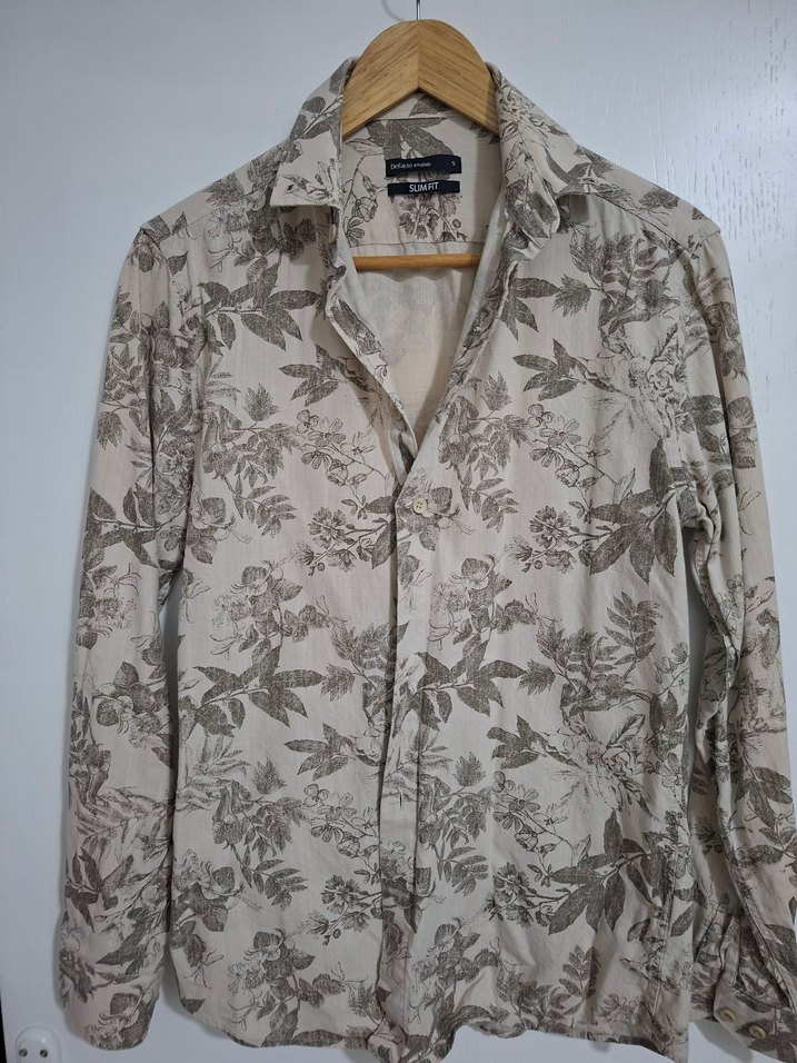 Uzun kollu, yakalı ve düğmeli erkek keten gömlek. Bej renkli, yaprak desenli ve rahat kesimlidir. Günlük ve ofis kullanımı için uygundur.