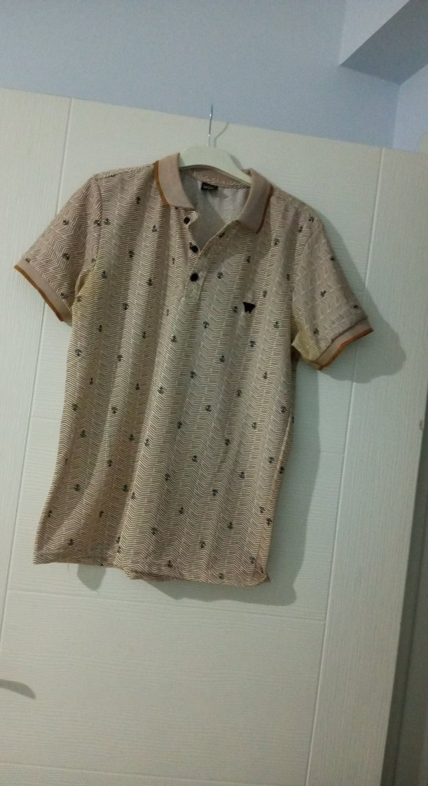 Bej renkli, kısa kollu, düğmeli ve yakalı erkek polo tişört. Baskılı deseni ve rahat kesimiyle günlük sokak stiline uygundur.