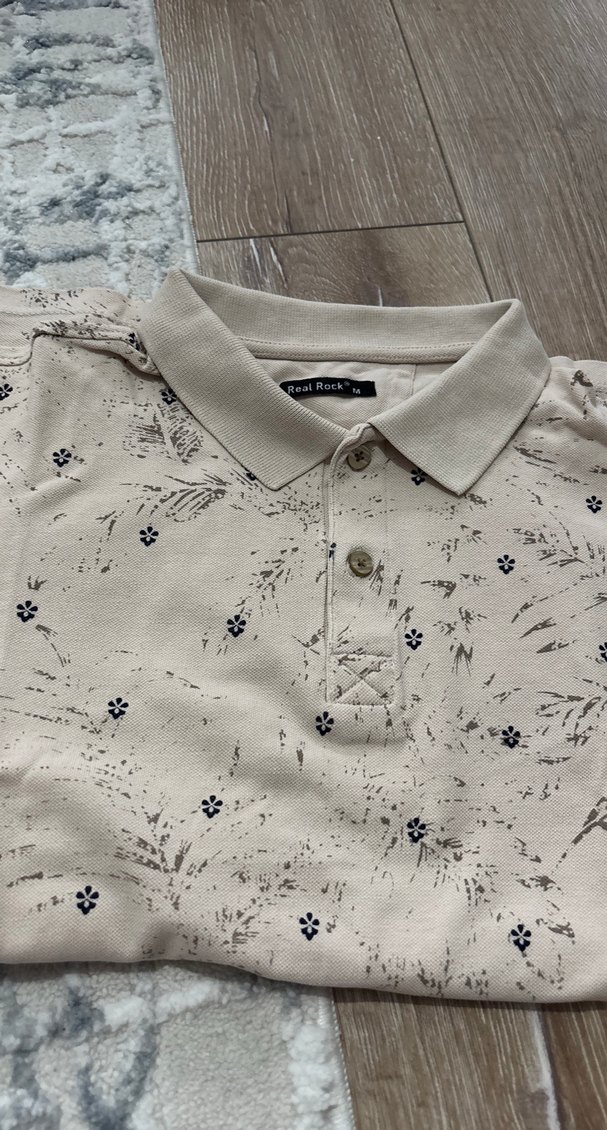 Bej renkli, kısa kollu, baskılı desenli, düğmeli yakalı, sentetik kumaştan üretilmiş, bol kesim ve günlük sokak stiline uygun erkek polo tişörtü.