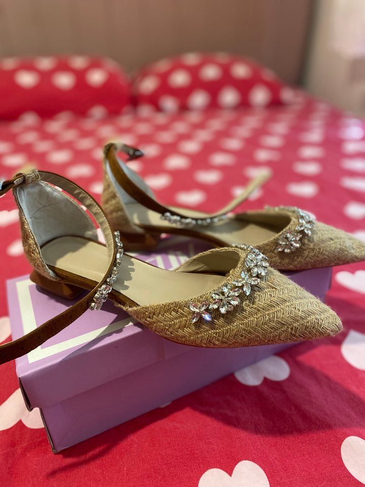 Bej renkli, ipeksi dokulu ve desenli espadril, stiletto topuklu ve tokalı kayışlı, vintage bohem tarzını yansıtan ayakkabi. Hic kullanilmadi