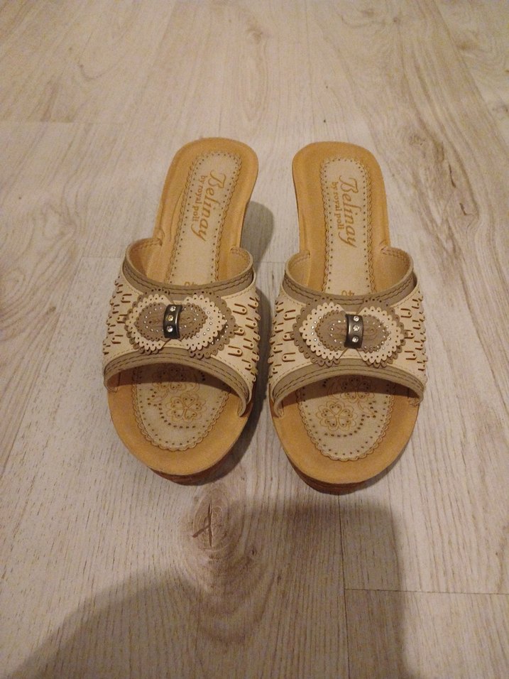 Bej renkli, dolgu topuklu kadın terlik. Parlak yüzeyli ve tokalı kayışlarıyla vintage ve bohem tarzı yansıtıyor.
