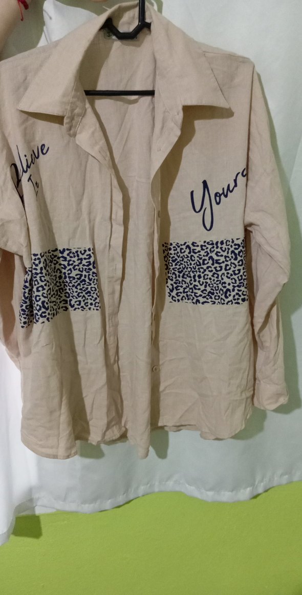 Bej keten kumaştan, uzun kollu, düğmeli ve desenli kadın gömleği. Salaş kesimi ve notched yaka ile günlük rahat stil sunar.Hiç giyilmedi