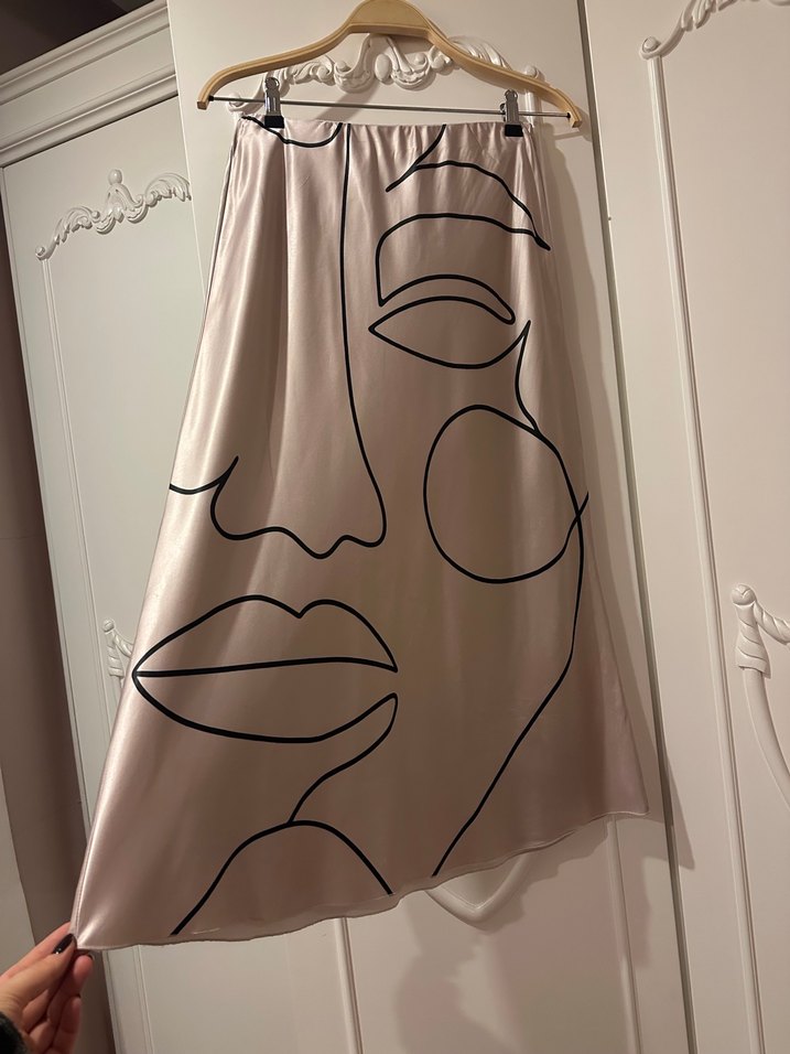 Bej renkte, dökümlü ve bol kesim, çağdaş desenli kadın midi eteği, günlük kullanıma uygundur.