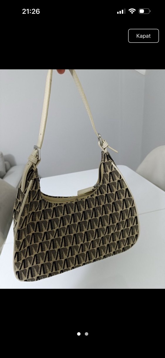 Bej renkli, desenli ve sentetik kumaştan yapılmış kadın omuz çantası. Fermuarlı kapama ve çağdaş tarz içerir, klasik şıklığa uygun.