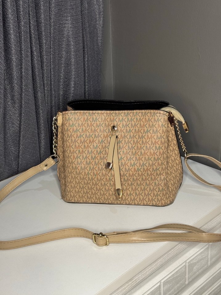 Bej renkte, MK desenli ve tokalı kadın omuz çantası, trend sokak stili için uygun.