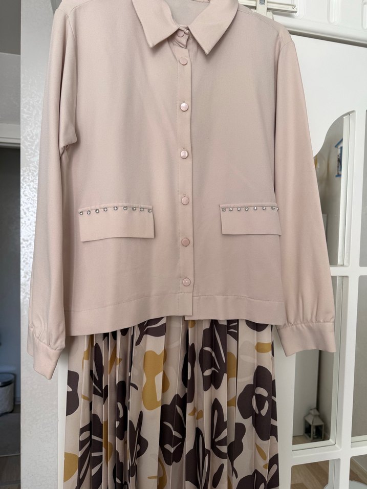 Bej renkli, düğmeli ve kesik yaka detaylı uzun kadın ceketi. Bol kesim ve uzun kolludur, etek kısmında desen bulunur. Yumuşak sentetik kumaştan üretilmiştir.