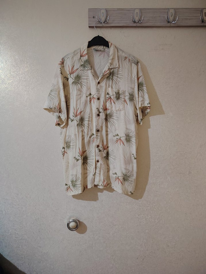 Keten kumaştan, düğmeli, kısa kollu, bol kesim erkek gömlek. Bej tonlarda pastel desenli, rahat ve günlük kullanıma uygun.