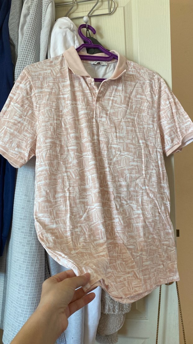 Bej renkli, pastel tonlarda desenli, kısa kollu, düğmeli ve yakalı erkek polo tişörtü. Rahat kesim ve normal boyda, ince keten kumaştan üretilmiştir.