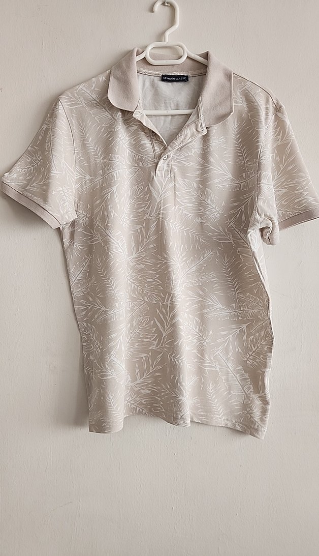 Bej renkli erkek polo yaka tişört, yakalı ve düğmeli ön detaylıdır. Rahat bol kesimdir. İki koltuk arası 57 cm, boyu ise omuzdan 71 cm dir. Temiz üründür söküğü, renk solması vs hiçbir şeyi yoktur.