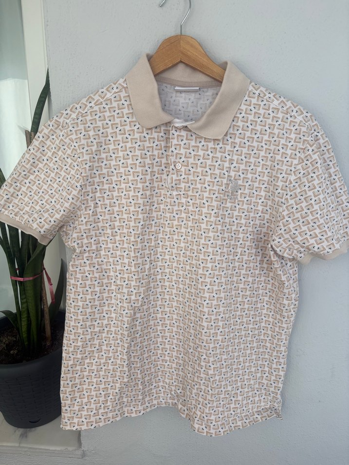 Yumuşak sentetik kumaştan, düğmeli yakalı, desenli ve bol kesim bej polo tişört. Günlük rahat stil için uygundur.