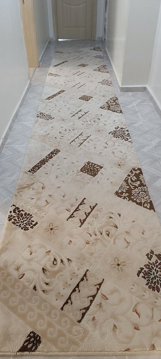 Bej renkte, çeşitli şekiller ve çiçek motifleri içeren desenli klasik halı.%100 Yün halı