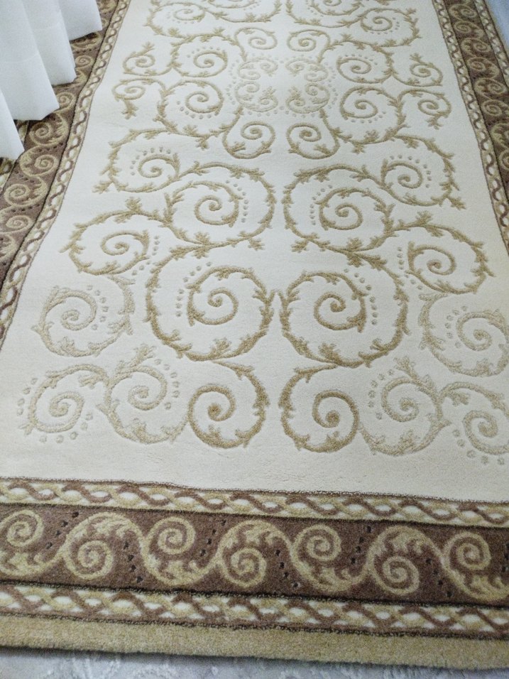 Bej renkli, desenli klasik halı. Zarif kıvrımlı desenler ve dekoratif kenarlık içerir. Hafif renk tonu ile mekana şıklık katar. Merinos halı
