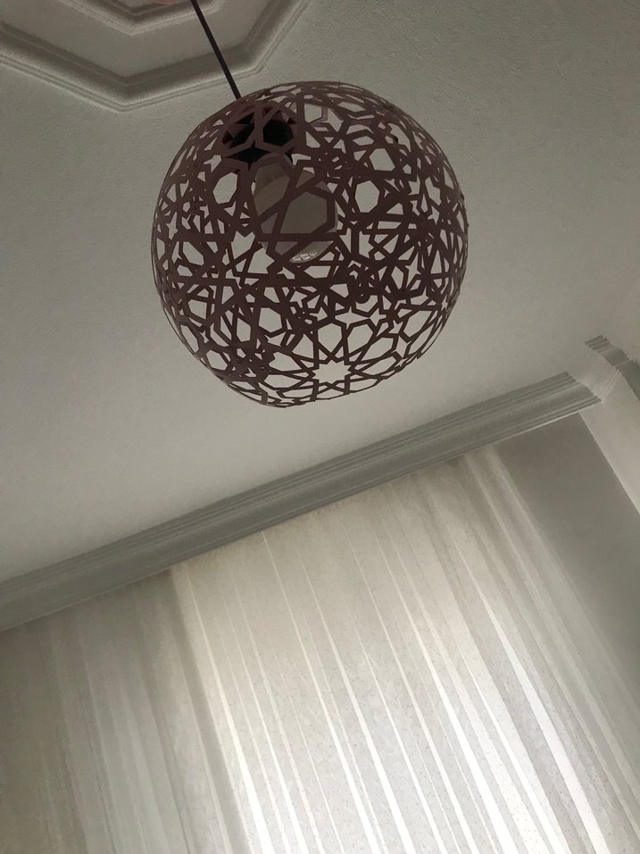 Bej renkli, desenli küre şeklinde avize, yumuşak aydınlatma sağlar ve ortama sıcaklık katar.