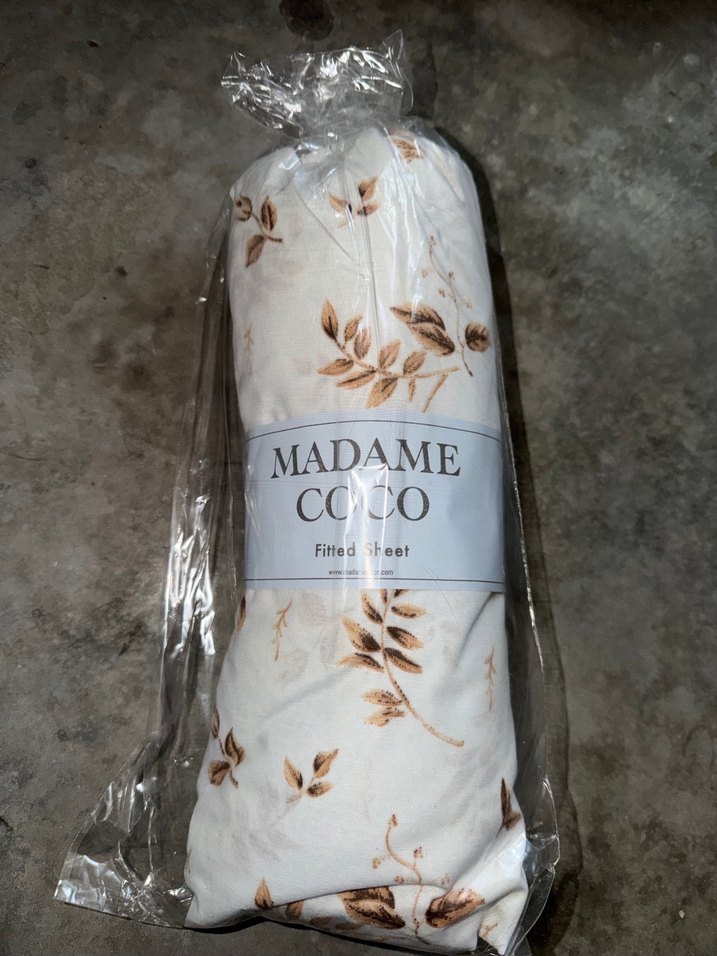 Madame Coco markalı, bej renkli, pastel yaprak desenli çarşaf. Yumuşak ve konforlu yatak örtüsü.