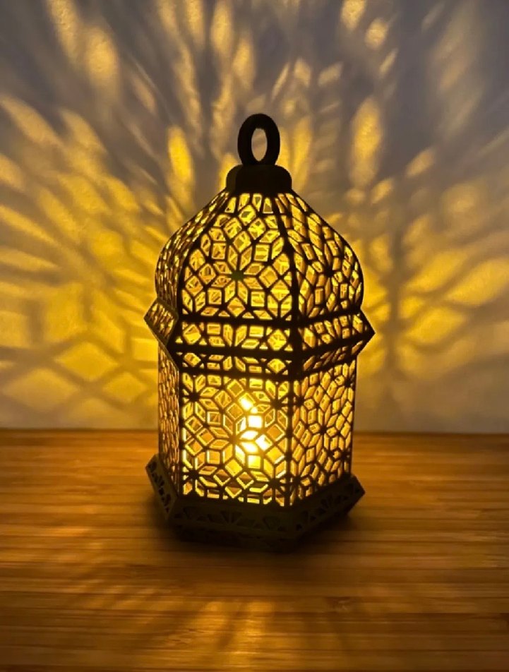 Masa lambası, mumluk, karmaşık geometrik desenlerle ışık gölgeleri oluşturur. Taşıma için halkası vardır. Sıcak bir atmosfer sağlar. ️