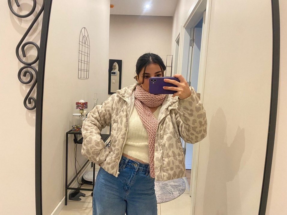 , uzun kollu ve balıkçı yaka kadın sisme mont. Bej renkli, bağlama desenli ve rahat kesimle günlük sokak stili için uygun.