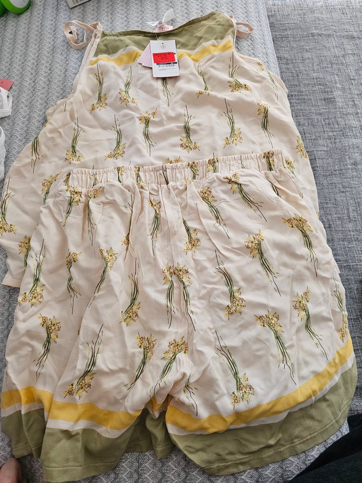 Pastel bej renkte, çiçek desenli, askısız ve kolsuz pijama takımı. Rahat ve bol kesim, kısa boy sıfır etiketli suwen marka