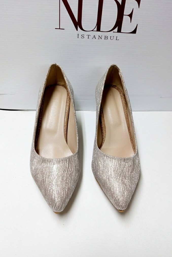 Sıfır ürün. Bej desenli, saten görünümlü pliseli stiletto topuklu minimalist ayakkabı, Marka: Nude Istanbul.( Marka temsilidir)36-40 numara aralığı mevcuttur.