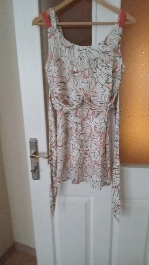 Bej renkli, straplez ve drapeli, desenli Kısa kollu ve vücuda oturan kesimiyle günlük kullanıma uygun, vintage bohem tarzda.