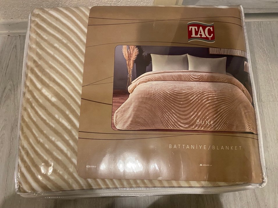 Tac markalı bej renkli, dalga desenli yumuşak dokulu battaniye. Ölçü: 220x240 cm. ️