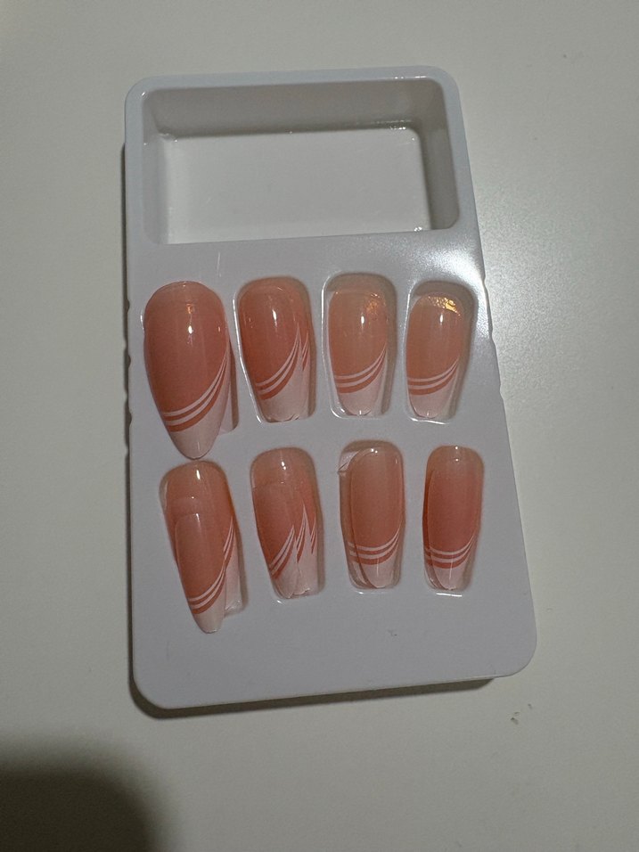 Açık bej renkli, denemelik kullandım ama yanlış almışım, beyaz desenli takma tırnaklar. Kolay uygulanır .. Yapışkanı da var