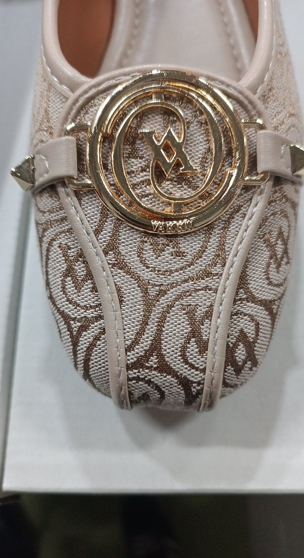 Bej renkli, blok topuklu kadın babet. Yılan derisi desenli ve tokalı detaylara sahip, kauçuk malzemeden üretilmiştir.