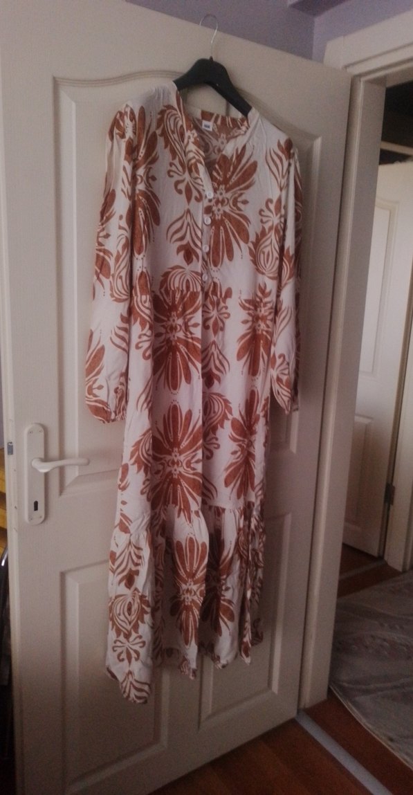 Bej renkli, uzun, bol kesim ve drapeli, V yakalı, uzun kollu, yumuşak viskon kumaştan yapılmış bohem tarzda elbise.