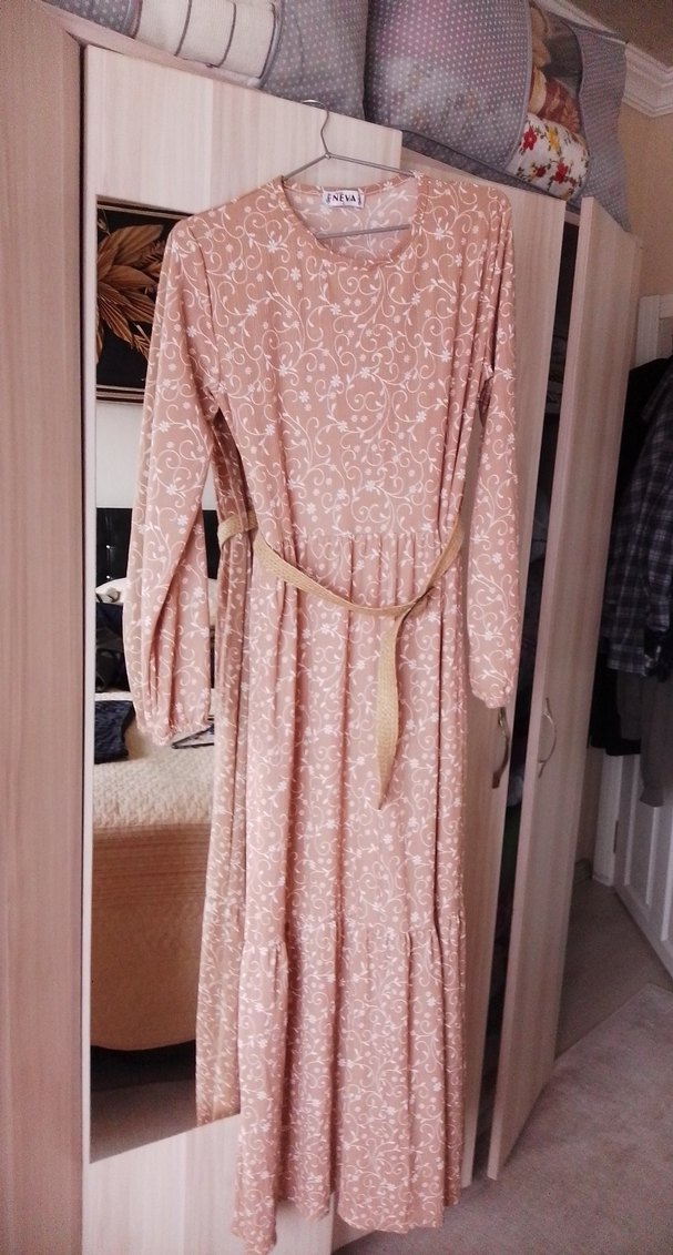 Bej renkte, desenli, uzun ve bol kesim elbise. Yumuşak sentetik kumaştan, yuvarlak yakalı ve belden bağlamalıdır. Bohem tarzı için uygundur.