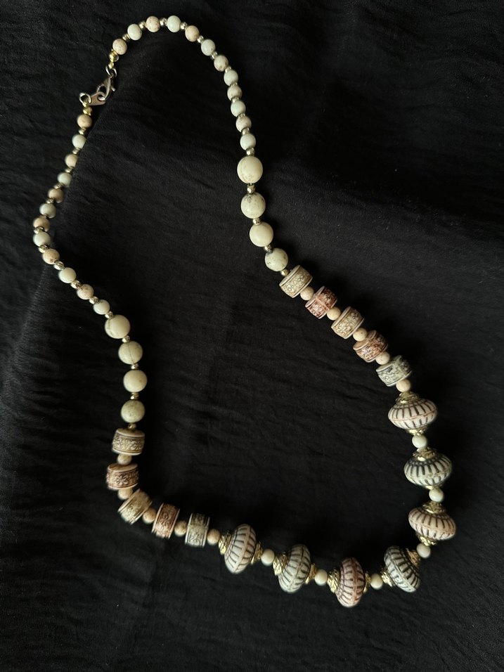 Bej Desenli Uzun Boncuklu Kadın Kolye/ Etnik Desenli