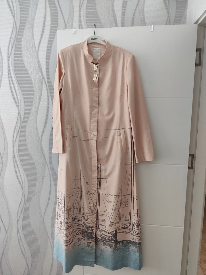 Bu uzun bej kadın ferace, etek kısmında tekne desenleriyle kumaştan yapılmıştır. Regular fit, uzun kollu ve düğmeli ön kapamalı, yakası kesik yakalıdır. Paris ve bohem tarzlarını yansıtır. Günlük kullanıma uygundur. ⛵