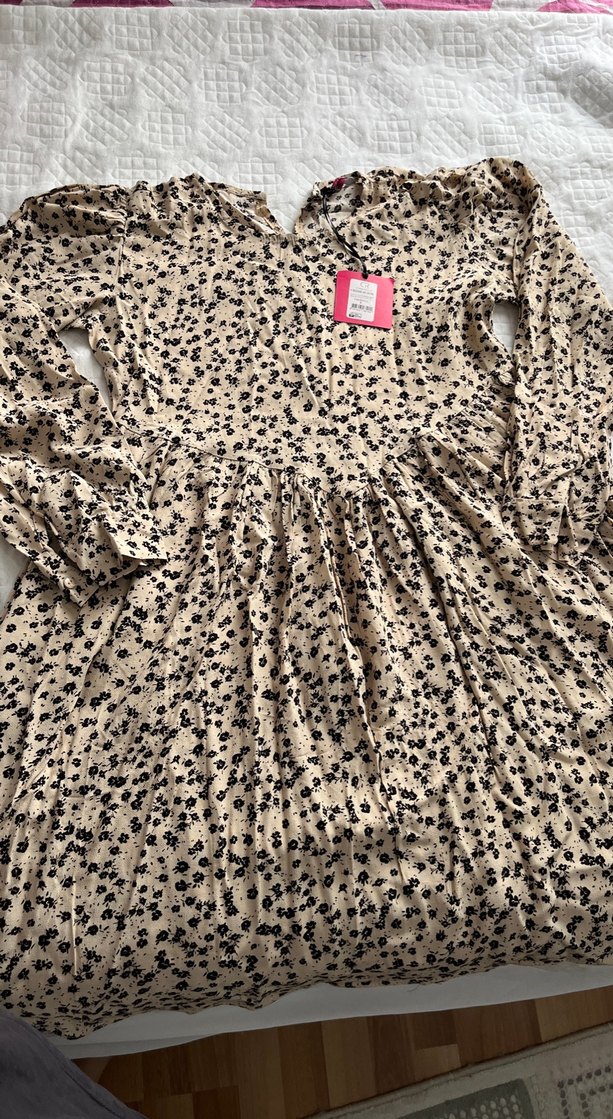 Bej renkli, uzun kollu, V yaka, bol kesim bohem elbise. Bürümcük ipek kumaştan üretilmiştir ve günlük kullanıma uygundur. Hiç kullanılmamıştır.S ve M beden mevcuttur.