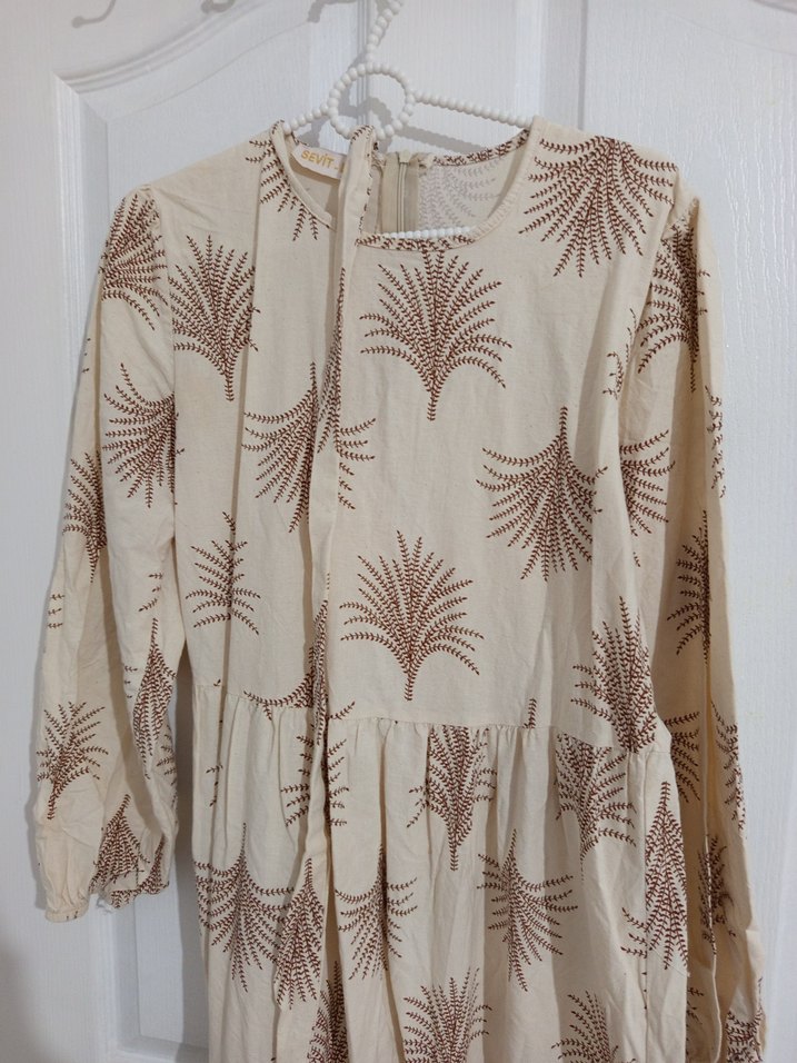 Uzun kollu, V yakalı, bej renkli ve desenli keten kumaştan yapılmış bol kesim bohem elbise. Günlük kullanıma uygundur.