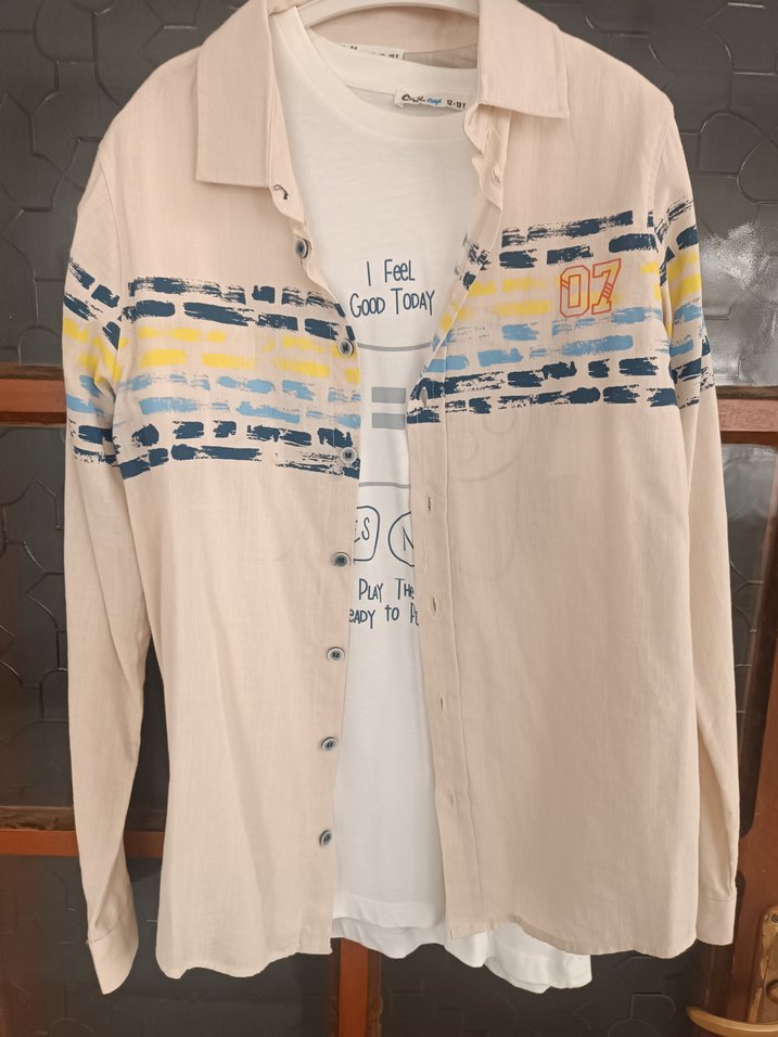 Bej renkli, desenli, uzun kollu ve düğmeli gömlek. Normal midi boyunda, bol kesim ve notlu yakaya sahip, günlük sokak stili için uygun.