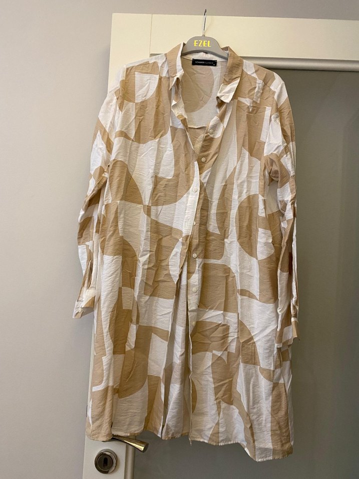 uzun kollu, yakalı ve düğmeli, bol kesim uzun gömlek. Günlük kullanıma uygun çağdaş desenli tasarım. bir kere giyildi.kusur yok.sifirdan farksiz