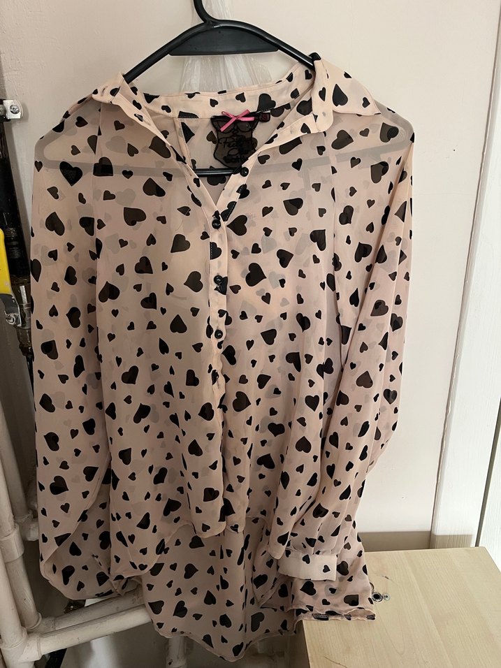 Bej renkte, uzun kollu, V yakalı kadın gömleği. Düğmeli ve desenli tasarımıyla Paris sokak modasına uygun, rahat kesim ve normal boyda.